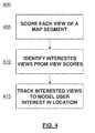 FIG. 4 is a flow diagram400 illustrating another example technique for analyzing usage of an interactive electronic map. In addition to maintaining a set of records corresponding to map segments and usage of the map segments, individual user views of or interactions with map segments in an interactive electronic map can be monitored and scored405. Individual map views can be scored405 to show user interest in the map segment, for example, based on evaluating data corresponding to a user's interaction with the map segment, or the presentation itself of the map segment to the user. As described in connection withFIG. 2, scores can be based on evaluating map segment usage against criteria adapted to predict user interest based on at least one property of the particular presentation of the map segment to the user. Based on the score of the map view, it can be determined or identified410 that the view was an “interested” view. In some instances, to qualify as an interested view the score of the view should exceed or otherwise surpass a particular threshold. As an example, the threshold can be a minimum view score. The threshold can be a fixed threshold for a subset or all of the map segments in an interactive map or a relative threshold. For instance, a map view can score above the “interested” threshold by scoring a certain percentage higher than surrounding or nearby map segments. Trends, patterns, and commonalities between interested views can be tracked415 and used to model user interest in a particular location corresponding to the map segment(s) viewed.