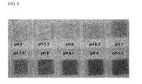 FIG. 9 is a photograph of a Post-Op sample dyed with a third combination of dyes, illustrating changes in colour of the dye combination in response to a buffered solution changing pH along a pH unit interval scale.