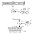 InFIG. 5, for detection of key corruption, theciphertext75 is encrypted (step76) by a MAC key77 to produce aMAC78. TheMAC78 is concatenated with the ciphertext75 to produce the wrapped key information.