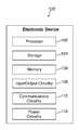 Power circuitry112 can include any suitable circuitry for providing power to components ofelectronic device100. For example,power circuitry112 can include one or more of a battery (e.g., a gel, nickel metal hydride, nickel cadmium, nickel hydrogen, lead acid, or lithium-ion battery), an uninterruptible or continuous power supply (UPS or CPS), and circuitry for processing power received from a power generation source (e.g., power generated by an electrical power plant and delivered to the user via an electrical socket). The received power can be provided as alternating current or direct current, and processed to transform power or limit received power to particular characteristics. For example, received power can be transformed to or from direct current, and constrained to one or more values of average power, effective power, peak power, energy per pulse, voltage, current (e.g., measured in amperes), or any other characteristic of received power.Power circuitry112 can be operative to request or provide particular amounts of power at different times, for example based on the needs or requirements ofelectronic device100 or periphery devices coupled to electronic device100 (e.g., request more power when charging a battery than when the battery is charged).