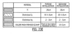 FIGS. 23A, 23B, and 23C, are respective top side, edge, and bottom side views of an LED (light emitting diode) packaging submount (with dimensions shown in mm) according to additional embodiments of the present invention.FIG. 23D is a enlarged cross sectional view of the submount ofFIGS. 23A, 23B, and 23C illustrating dimensions of top side and bottom side metallizations, andFIG. 23E is a table providing a legend of materials and dimensions. A patterned metallization (e.g., including electroless copper on titanium and/or gold) on the top side of the submount may provide a positiveelectrical contact2301, a negativeelectrical contact2303, and a plurality ofinterconnection islands2305 therebetween. As discussed above, each of the interconnection islands may provide an electrical coupling between two serially coupled LEDs in an assembled device. Moreover, electrically insulatinggaps2307 may separate the positiveelectrical contact2301, the negativeelectrical contact2303, and theinterconnection islands2305. By providing an optically reflective surface of the metallization and by providing a reflective material (e.g., white solder mask) in the electrically insulating gaps, a light output of the assembled device may be improved.