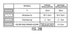 FIGS. 29A, 29B, and 29C, are respective top side, edge, and bottom side views of an LED (light emitting diode) packaging submount (with dimensions shown in mm) according to additional embodiments of the present invention.FIG. 29D is a enlarged cross sectional view of the submount ofFIGS. 29A, 29B, and 29C illustrating dimensions of top side and bottom side metallizations, andFIG. 29E is a table providing a legend of materials and dimensions. A patterned metallization (e.g., including electroless copper on titanium and/or gold) on the top side of the submount may provide a positiveelectrical contact2901, a negativeelectrical contact2903, and a plurality ofinterconnection islands2905 therebetween. As discussed above, each of the interconnection islands may provide an electrical coupling between two serially coupled LEDs in an assembled device. Moreover, electrically insulatinggaps2907 may separate the positiveelectrical contact2901, the negativeelectrical contact2903, and theinterconnection islands2905. By providing an optically reflective surface of the metallization and by providing a reflective material (e.g., white solder mask) in the electrically insulating gaps, a light output of the assembled device may be improved.