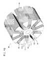 FIG. 11 is a perspective view of the rotor core ofFIG. 10 with a rotated end lamination and permanent magnets;