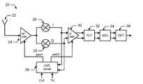 In some cases, the amplitude of the RF signal received byantenna22 may vary over a wide dynamic range, and such variance may adversely affect receiver performance. For example, received RF signals with amplitudes that are too high or too low may not be accurately detected bywireless receiver20, due to receiver saturation (when the RF signal amplitude is too high) or sensitivity limitations (when the RF signal amplitude is too low). For this reason, an automatic gain control (AGC)circuit38 may be included in a feedback loop (or alternatively, in a feedforward loop) to compensate for variations in the received signal strength by adjusting the amount of gain (gain1, gain2) applied to the RF and IF signals by the RF and IFamplifiers24 and30.