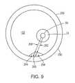 In one embodiment, one way to address this radial offset (θ) is to measure the offset accurately after manufacture. This may be accomplished by placing the probe head into a cylindrical fixture having known patterns on the walls of its lumen. Next the probe head is withdrawn and IVUS and OCT images are captured. Because the actual features are known, the images taken with OCT and IVUS can then be co-registered. By counting the number of frames between the OCT image of an area of wall and the IVUS image of the same area of wall, the delay between images can be determined. By noting how many degrees of rotation are needed to align the images, (θ) can be determined. This information may be encoded into a bar code or equivalent or an RFID tag attached to the probe connector20 (FIG. 1). The user of thesystem10 can then program this information into the system using a bar code reader or RFID reader so that the IVUS and OCT images are displayed together with the same orientation and magnification.