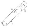Alternatively, the system can self-calibrate using one of several imaging techniques. In one embodiment, referring toFIG. 4(a), the sheath31 (FIG. 1) is manufactured with a discontinuouscylindrical annulus100 attached to the outside wall or inside wall of thesheath31. InFIG. 4(b), an end-on view of theannulus100′ is shown. Alternatively, the sheath may have afiducial bar104, shown end-on inFIG. 4(c). In both cases, thefiducial bar104 and discontinuouscylindrical annulus100, collectively referred to as a fiducial marker, provide an asymmetry in the image which is detectable by both OCT and IVUS imaging. Note that thefiducial bar104 and the discontinuousfiducial annulus100 are not used together on thesame sheath31, and are shown together only to provide positioning information. The fiducial marker may be made of any optically opaque material that has a different optical density and acoustic attenuation than thesheath31. The fiducial marker may be positioned anywhere along thesheath31, but generally near one end of the region through which the probe head must pass during pull back.