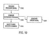 Referring toFIGS. 4 and 10,servo device27 may include a microprocessor circuit having associated operating software for reading the pressure signals and translating the signals into machine readable code. This may be accomplished with appropriate analog to digital converter devices, as is known in the art.Servo device27 continuously monitors and regulates the pressure during an ophthalmic procedure, in particular a method of treating glaucoma. Referring toFIG. 10, in order to regulate pressure, in step S101, servo device processes pressure signals frompressure sensors83. In step S103, the pressure signals are compared with a desired reference pressures. In step,S105 servo device27 injects fluids, such as a viscoelastic fluid, into anterior chamber7 of the eye in order to maintain the reference pressure or to adjust to a desired pressure level. In addition, in step, S107,servo device27 may generate an error signal when the sensed pressure level becomes other than the desired reference level. Optionally, apressure indicator display62 may be located onhandset25.Pressure sensor83 may be located at a distal end ofprobe23. In addition,pressure sensor83 may be located along the shaft ofprobe23. Optionally, more than one pressure sensor may be mounted onprobe23 at various locations.