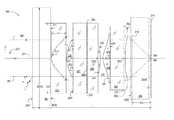 FIG. 13 is a plot of the Petzval field curvature, as a function of field angle, ofcompound lens900. The field curvature is plotted for field angles between zero and α2. Field curvature1348-S and field curvature1348-T (solid lines) are computed at wavelength λFin the sagittal and tangential planes, respectively. Field curvature1358-S and field curvature1358-T (short-dashed lines) are computed at wavelength λdin the sagittal and tangential planes, respectively. Field curvature1365-S and field curvature1365-T (long-dashed lines) correspond to field curvature at wavelength λCin the sagittal and tangential planes, respectively.