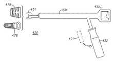 In a second example, the vertebral component is apedicle screw478. Thepedicle screw478 is a particular type of bone screw designed for implantation into a vertebral pedicle. There are two pedicles per vertebra that couple to other structures (e.g. lamina, vertebral arch). A polyaxial pedicle screw may be made of titanium to resist corrosion and increase component strength. The pedicle screw length ranges from 30 mm to 60 mm. The diameter ranges from 5.0 mm to 8.5 mm. It is not limited to these dimensions, which serve as dimensional examples.Pedicle screw478 can be used in instrumentation procedures to affix rods and plates to the spine to correct deformity, and/or treat trauma. It can be used to immobilize part of the spine to assist fusion by holding bony structures together. By way of electronic assembly401 (which may be internally or externally integrated), theinsert instrument420 can determine depth and angle for screw placement and guide the screw therein. In the example, one or more accelerometers are used to provide orientation, rotation, angle, or position information oftip451 during an insertion process.