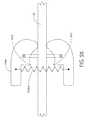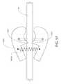 FIGS. 57 and 58 depict an alternate embodiment of alock1936 that clips onto thefilament34 upon release fromtamper106. Specifically,lock1936 is configured to be biased to conform to the configuration depicted inFIG. 57 vis-à-vis thefilament34 from that depicted inFIG. 58. In an exemplary embodiment, thelock1936 is spring-loaded bysprings1936A so that it springs to the configuration depicted inFIG. 57, whereby nips1937 compress thefilament34, thereby increasing the friction force between thelock1936 and thefilament34 required to be overcome to move the lock1936 (relative to the friction force, if any, resulting from the configuration depicted inFIG. 58, where the filament easily slides through the lock1936). In an exemplary embodiment of deploying thelock1936, thelock1936 is initially positioned on atamper106 as depicted inFIG. 59. As can be seen, tamper106 holds thelock1936 in the position depicted inFIG. 58, where little if any friction force must be overcome between thelock1936 and thefilament34 to move thelock1936 relative tofilament34. After thelock1936 is positioned as desired by driving thetamper106 towards the anchor32 (i.e., to the right with respect toFIG. 59), thetamper106 is withdrawn in the opposite direction. The little friction force between thelock1936 and thefilament34 is sufficient to drag thelock1936 from thetamper106, thereby ejecting thelock1936 from thetamper106. Alternatively or in addition to this, asecond tamper206 is pushed along thefirst tamper106 to drive thelock1936 from thetamper106, as depicted inFIG. 59, while applying a tension tofilament34 in the opposite direction of which thesecond tamper206 is moved. After thelock1936 is ejected from the tamper106 (either through use oftamper206 or via the little friction that exists between thelock1936 and the filament before thelock1936 takes the configuration depicted inFIG. 57), the lock springs to the configuration depicted inFIG. 57, thereby increasing the friction force that must be overcome between thefilament34 and thelock1936 to move thelock1936 relative to thefilament34. The tamper may then be advanced again towards theanchor32 using thetamper106 to push thelock1936 along thefilament34 while applying tension to thefilament34 in the opposite direction in a manner analogous to the deployment of the other locks detailed herein.