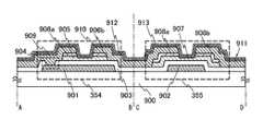 InFIG. 9A, afirst gate electrode901 and asecond gate electrode902 are provided over asubstrate900. A material of thefirst gate electrode901 and thesecond gate electrode902 is desirably formed of a low resistance conductive material, such as aluminum (Al), or copper (Cu). Since aluminum itself has disadvantages such as low heat resistance and a tendency to be corroded, it is used in combination with a conductive material having heat resistance. As a heat-resistant conductive material, an element selected from titanium (Ti), tantalum (Ta), tungsten (W), molybdenum (Mo), chromium (Cr), neodymium (Nd), and scandium (Sc), an alloy containing any of these elements, an alloy film including a combination of these elements, or a nitride containing any of these elements is used.