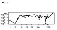 FIG. 14 depicts variation in total fecal bacterial density and specific taxa for an infant treated with antibiotics. Taken from Palmer et al, Ibid. Estimated rRNA gene copies per gram of feces (y-axis) are plotted as a function of days of life (x-axis). Both axes are on a logarithmic scale. Episodes of antibacterial treatment are indicated on the temporal axis by gray bars. Within a few days of the antibiotic treatment, a sharp increase in the levels ofBacteroidesandCytophagawere observed (from less than 40 rRNA gene copies per gram of feces to over 80 rRNA gene copies per gram). Similarly, levels ofBacilliand related species sharply increased during the time of antibiotic treatment, from a pre-treatment low of negligible levels to a high of over 60 rRNA gene copies per gram of feces. After antibiotic treatment, the levels ofBacilliand related species returned to negligible levels. However, levels ofClostridiaand related species, which had been negligible or under 20 rRNA gene copies per gram of feces from birth until the time of antibiotic treatment, increased after antibiotic treatment to approximately 20 rRNA gene copies per gram of feces and maintained this increase for the duration of the study period. Systems as those described herein monitor such post-antibiotic use increases in specific pathogen species or classes and suggest interventions to improve health after the end of an antibiotic course.