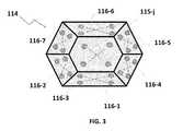 In another aspect of the disclosure, the drone antenna sub-system design is described, as shown inFIG. 3. First consider the case where only one antenna fixture is installed on each drone. One issue with a single antenna fixture is that the size of the antenna aperture needs to be large in order to scan beams across the coverage area from high elevation angles of 45° or more to low elevation angles of 2°, from the GTs to drones, to avoid significant beam scan loss. The scan loss problem may be mitigated using the antenna fixture structure ofFIG. 3.Antenna fixture114 ofFIG. 3 has a central antenna aperture116-1 which is designed to cover areas that are at higher elevation angles with respect to the drone, i.e. locations close to the drone. Antenna apertures116-j, j=2, . . . , 7 inFIG. 3, are placed at an angle relative to the central aperture116-1 in a way to better cover areas that are at low elevation angles and farther from the drone. Antenna fixture ofFIG. 3 would be installed under and at the center of the drone with the larger base attached to the drone and the aperture116-1 looking down. Then, since the apertures116-2, . . . ,116-7 are tilted toward father distances, they have less beam scanning loss toward lower elevation angles than a single aperture design would have. Each antenna aperture may consist of a number of antenna elements115-j which are used to electronically form and steer a beam.