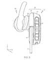 Thetip30 includes a retainingloop32 that is constructed and arranged for positioning along the antihelix of the ear, and for providing a pivot point with respect to theearbud tip30 andearbud26, so that theloop32,earbud tip30, andearbud26 each rotate relative to the pivot point when one or more forces are applied to theheadphone10. See U.S. Pat. No. 8,249,287, and U.S. Patent Publication No. 2013/0230204, both incorporated here by reference.