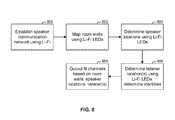 Asymbol modulator908 may be controlled by theassembly processor904 to output Li-Fi communication symbols through a Li-Fi transmitter910, which may be implemented by one or more LED. Li-Fi and other light signals may be received by areceiver912 such as a photodiode and provided through themodulator908 to theassembly processor904. A power module914 such as a battery or ac-dc converter may provide power to appropriate components of theLED assembly68, and aposition sensor916 such as but not limited to a global positioning satellite (GPS) sensor may provide location information to theassembly processor904. In this example, by means of the GPS information, eachLED assembly68 may know its location and may signal that location, as well as the below-described detected wall, speaker, and listener locations relative to the respective LED assembly location, to other LED assemblies in theenclosure70.