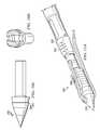 Thedistal end section46 preferably is adapted to pierce bone. The piercing tip may facilitate the anchor to be pounded or driven into bone with a mallet or hammer-like instrument. The shape of the tip may vary widely. It may be solid, and comprise a sharp point. A dart shape is shown inFIG. 3B. The tip increases in diameter from the distal point at an angle (α) from the centerline ranging from about 20 to 27 degrees and preferably about 23 degrees. Thedistal tip46 increases in diameter from the distal to the proximal end until a maximum diameter is reached (D1) at the proximal end of theend section46. Preferably, D1 ranges from 0.15 to 0.25 inch and more preferably from about 0.18 inch. However, the invention is intended only to be limited as recited in the appended claims.