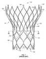 Stent102 may also include a plurality of commissure features166 for attaching the commissure between two adjacent leaflets tostent102. Commissure features166 may lie at the intersection of fourcells162, two of the cells being adjacent one another in the same annular row, and the other two cells being in different annular rows and lying in end-to-end relationship. Preferably, commissure features166 are positioned entirely withinannulus section140 or at the juncture ofannulus section140 andtransition section141. Commissure features166 may include one or more eyelets which facilitate the suturing of the leaflet commissure tostent102.