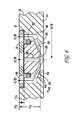 Also shown inFIG. 8, in some embodiments, the first sealable surface provides122 anangular transition144 between d1and d2of the first concentric cylinder and the second concentric cylinder of thebore120 ofhousing152. In some embodiments, the secondsealable surface128 of thenozzle insert116 is angularly disposed, in a complementary manner, to mate with theangular transition144 of the firstsealable surface122.