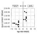 InFIG. 1, the results of measurement of the read current in the case where writing was performed in the linear region with the voltage Vds applied between the drain and the source being set to 20-30 V during the writing, and thereafter, reading was performed with the voltage Vds applied between the drain and the source being set to 10 V and the voltage Vgs applied between the gate and the source being set to −10 V are plotted with solid diamonds “♦”. The results of measurement of the read current in the case where writing was performed in the saturation region with the voltage Vds applied between the drain and the source being set to 20-30 V during the writing, and thereafter, reading was performed with the voltage Vds applied between the drain and the source being set to 10 V and the voltage Vgs applied between the gate and the source being set to −10 V are plotted with solid boxes “▪”. Note that the voltage Vds applied during reading is not limited to 10 V, and the voltage Vgs applied during reading is not limited to −10 V. From the viewpoint of low power consumption, it is preferred that the voltages Vds, Vgs are smaller. For example, the voltage Vds can be set to 0.1 V.