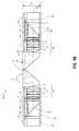 The MTF curves shown in1402,1404 and1406 inFIGS. 7B, 7D, and 7F are examples of MTF performance of the L1-L6 assembly when the camera is focused at the distances provided above forFIGS. 7A, 7C, and 7E, respectively. The graphs show the MTF curves at angular direction, with respect to the optical axis, in the Field of View (FoV) of the camera, shown on the graphs as “Y Field in Degrees. The solid line represents the Sagittal performance and the dashed line represents the Tangential performance.
