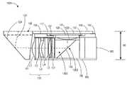 Another embodiment of a suitable folded optic system is to use themirror surface135 as a secondary light directing surface without a surrounding prism. Accordingly, illustrated element ofprism portions136A,136B are removed and only themirror surface135 remains. A structure design to secure amirror135 can be used to guide theguide rail185.