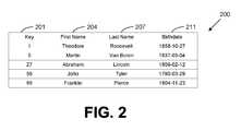 Referring next toFIG. 2, shown is a diagram200 of an example database table implementing content identifiers127 (FIG. 1) generated by adata layer service114 according to various embodiments of the present disclosure.Item201 is a column indicating acontent identifier127 for a respective content data124 (FIG. 1) entry. In this example diagram200, thecontent identifiers127 ofitem201 correspond to a key of a relational database table, and are randomly generated.Item204 is a column representative of a portion ofcontent data124 corresponding to a first name.Item207 is a column representative of a portion ofcontent data124 corresponding to a last name.Item211 is a column representative of a portion ofcontent data124 corresponding to a birth date.