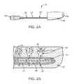 FIG. 2B is a cross-section of the resilientfoam contact element30. Theelongate shaft24 extends under thefoam contact element30, andsupport wire28 preferably extends throughlumen25 of theelongate shaft24 underfoam contact element30. One ormore pores38 extend laterally through the sidewall ofshaft24 so that they are in fluid communication withlumen25 which serves as areservoir34 for the toxin or therapeutic agent to be delivered. Thereservoir34 may also be a pressure filled bladder. Thereservoir34 may extend only under thefoam contact element30, or it may extend proximally beyond thefoam contact element30 intoshaft24.Foam contact element30 may be a hydrophilic material to help hold and distribute the therapeutic agent. The foam contact element32 also may includechannels36, perforations, or slits which help direct the therapeutic agent to flow40 from thelumen25 which acts asreservoir34, through thepores38 in the shaft sidewall, through thefoam contact element30 to a surface of the foam contact element for delivery to the target tissue which in this embodiment is preferably nasopharyngeal mucosa tissue. Thus, in this embodiment, a syringe or other device may be coupled to theconnector26 and the lumen may be filled with a therapeutic agent. Thus thelumen25 acts as a reservoir for the therapeutic agent. The therapeutic agent will be absorbed by the foam contact element for delivery to the tissue. Additional actuation of the syringe may be used to pressurize the therapeutic agent within the reservoir to help it flow outward into the foam contact element. Thus, the foam contact element acts as an absorbent and porous pad. Additionally, the foam contact element, which may be made from any number of polymeric foam materials or woven or nonwoven materials including fabrics or synthetics, is preferably resilient so that it may have a collapsed low profile configuration suitable for delivery through the confined space of the nostrils and nasal cavity, and also have an expanded larger profile for maximum tissue contact. The foam contact element may be constrained in the low profile collapsed configuration with a sheath, cannula, or other constraining element (not illustrated), and it may expand once the sheath or constraining element is removed. In preferred embodiments, the foam contact element in the collapsed configuration has a cross-section less than or equal to a 6 mm diameter cylindrical shaft. Additionally, wetting of the foam contact element with the therapeutic agent may further facilitate expansion thereof.
