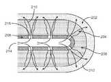 FIG. 6 illustrates an alternative embodiment of a foam contact element or porous pad material that may be used with any of the foam contact element embodiments described herein. Thefoam contact element212 may be coupled to an elongate shaft as previously described above, or it may be coupled to other delivery instruments, or used alone. Thefoam contact element212 includes anouter foam layer202 that surrounds theporous reservoir208 having acentral lumen214 for holding a therapeutic agent, and pores216 that allow the therapeutic agent to be released therefrom. A layer ofhydrophobic foam206 is disposed between theouter foam layer202 and theporous reservoir208.Channels204 are disposed in thehydrophobic foam layer206 and they help direct the therapeutic agent to theouter foam layer202. This configuration provides a large outer surface area for contact with tissue for delivering the therapeutic agent, while minimizing the volume of therapeutic agent that is absorbed into the foam due to the hydrophobic layer.