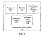 Referring now to the drawings in which like numerals represent the same or similar elements and initially toFIG. 1, asystem100 for controlling game actions is shown. A user fitness profile database106 is stored in amemory104 to store user fitness and health information. This database106 may be used to suggest game sequences that are best suited to the user's particular fitness needs. For example, if the user has knee pain, this fact would be stored in the database106 and could be used to select game sequences that will avoid provoking further knee injuries or which may even provide therapeutic benefits. Auser state monitor108 monitors the user's current physical and cognitive state. The user's physical state may include a level of activity (measured by, e.g., the user's heart rate) or mental state (e.g., anxiety, drowsiness, etc.) and may be performed by one or more sensors that may include accelerometers, biometric sensors, biofeedback sensors, brainwave sensors, heart rate monitors, etc. Theuser state monitor108 can be integrated with a controller for a video game system, such that the user need not use a separate peripheral device.
