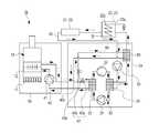 Since the low-temperature medium raised in temperature at thecondenser34 is supplied to thewater storage tank22a, the low-temperature medium stored in thewater storage tank22arises in temperature. The hot water generator22 thus generates hot water at a predetermined temperature. The heater21 radiates heat in response to the low-temperature medium raised in temperature at thecondenser34. The heater21 thus performs a heating operation.