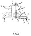 FIG. 2 is a side view of a fluid application and recovery system according to one embodiment of the present invention, and shown in isolation with respect to certain additional features of the present disclosure. As shown, arecovery pump40 is provided for translating fluids. Therecovery pump40 comprises a mechanical pump driven by ground-induced rotational movement of adrive wheel31.Additional wheels30,32 are provided for supporting the device and/or providing rotational power to thedrive wheel31 and associatedpump40. Accordingly, movement of the device along a surface provides the power required to drive apump40 and draw fluid from a ground or floor surface. The pressure differential created by thepump40 draws a fluid from the floor viarecovery line52 which is operatively associated with a pick-uporifice48 located proximal to the floor.Clean fluid47 dispensed from thedevice10 contacts and cleans the floor as it is converted todirty fluid44 and subsequently transported or picked up by thepump40 and conveyed to arecovery tank28 or similar receptacle.