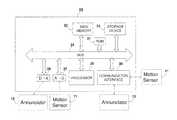 Thecontrol system20 may communicate with themotion sensor11 and theannunciator13 via a digital communication link usingCommunication Interface26 coupled tobus24. In the case of amotion sensor11 having an analog output, an Analog-to-Digital (A/D)converter27 which converts continuous signals to discrete digital numbers is used, coupled between themotion sensor11 and thebus24. In the case theannunciator13 is having an analog input, a Digital-to-Analog (D/A)converter28 which converts a digital (usually binary) code to an analog signal (current, voltage or electric charge) coupled between theannunciator13 and thebus24. Other signal conditioning may also be applied in order to improve the handling of the motion sensor output or to adapt to control or activate the annunciator, such as attenuation, delay, filtering, amplifying, digitizing and any other signal manipulation.