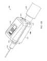Along axis1218 of the assembly is shown to illustrate an axial alignment or in-line assembly of components, including theprobe1204 andsyringe1206 coupled with thedevice1208. Components need not be limited to any particular positioning with respect to the long axis. But axial alignment or in-line assembly will generally refer to an ordered arrangement of certain components with respect to a long axis reference. In the embodiment illustrated inFIG. 10B (and additionally in certain embodiments described further herein), the assembly includes an in-line arrangement with thedevice1208 disposed substantially between the coupledprobe1204 and thesyringe1206. Referring to thedevice1202, certain components (e.g., sensing unit, processing unit, output unit, display, etc.) can be carried by thehousing1208 so as to be disposed substantially betweenport1210 andport1212. Thedisplay1214 can be carried by thehousing1208 such that thedisplay1214 or surface thereof (e.g., outer surface) is at an angle with respect to thelong axis1218 of theassembly1200. For example, the display can be angled proximately as illustrated inFIGS. 10A and 10B. Such a configuration of the display may be selected so as to allow a user, viewing the display from a location generally proximal to the device, to more easily view the display during operation.