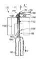 Similar to theflexible filament body40, theflexible filament body140 can be actuated by applying tension in a direction away from the body, such as by applying tension approximately in a direction C′ to thegraft190 and/or thecoil162a, as shown inFIG. 5A. As shown inFIG. 4, theother coil162bis proximate to thebody140 as thebody140 is actuated, and thecoil162bactually becomes part of the mass that defines thebody140 in the anchoring configuration, as shown inFIGS. 5A and 5B. Tension can then be applied to theclosure tails180,182, for instance by applying it approximately in a direction K′ as shown inFIG. 5B, to decrease a size of the opening164a, and in turn pull thegraft190 towards and into thetunnel1100′ as shown inFIG. 5B. As also shown inFIG. 5B, one or more-half hitches184 can be formed on at least one of thetails180,182 to lock the slidingportion170 in place, and thus maintain a location of the slidingportion170, thecoil162a, and thegraft190 with respect to thebody140.