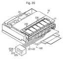 Each of theattachments220 has an outline identical to the outline of thetypical cartridge18 ofFIG. 25. With reference toFIG. 21, a secondliquid outlet port54 and a secondair inlet port75 are defined at an end of ahollow casing220A of eachattachment220, which is formed of hard resin. The secondliquid outlet port54 serves as a first connection port through which the ink Ik is sent out of thehollow casing220A. The secondair inlet port75 serves as a second connection port through which pressurized air is supplied from the exterior into thehollow casing220A.