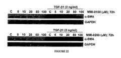 Therefore, since fibroblasts are the key cells involved in scar formation, the effect of MMI-0100 (YARAAARQARAKALARQLGVAA; SEQ ID NO: 1) on myofibroblast activation was assessed by examining the protein levels of α-smooth muscle actin (α-SMA) and fibronectin in cultured human fetal lung fibroblasts (IMR-90 cells) treated with TGF-β. As shown inFIGS. 22 and 23, MMI-0100 (YARAAARQARAKALARQLGVAA; SEQ ID NO: 1) effectively prevented myofibroblast activation induced by TGF-β in a dose-dependent manner, as shown by decreases in the levels of both α-smooth muscle actin (α-SMA) (FIG. 22) and fibronectin (FIG. 23).