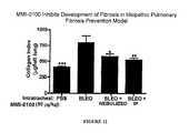 Next, total collagen levels in the lungs of the bleomycin-injured mice (FIG. 12) were analyzed quantitatively by computing a constant conversion factor (7.5) for collagen from hydroxyproline concentrations (Neuman R. and Logan M,J Biol Chem.,186(2):549-56, 1950, incorporated by reference). As shown inFIG. 12, both nebulized (BLEO+NEBULIZED) and systemic (BLEO+IP) administration of MMI-0100 (YARAAARQARAKALARQLGVAA; SEQ ID NO: 1) during the post-inflammatory/pre-fibrotic stage significantly decreased collagen deposition compared to the bleomycin control.