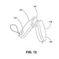 FIG. 12 shows a front view of holdingassembly100 when in the closed position. Atab122 is included having anaperture124 to accept additional means attaching holdingassembly100 to a support, such astether110.Teeth116 are shown attached to the lower portion ofcamera attachment section104 for gripping a support.