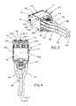 Disposed in the respective inner surfaces of the upper and lower release levers22,24 are engagingtabs22aand24a, as seen inFIG. 7. Displacement of the upper and lower release levers22,24 toward one another causes their respectiveengaging tabs22aand24ato engage the upper and lowerplug release actuators26 and28, respectively. The upperplug release actuator26 is pivotally displaced downwardly about its aftcylindrical bar46 causing its forward extending arms48a-cto engage plug latches64c-adisposed on upper portions ofplugs14c-a, as seen inFIGS. 1, 2 and 5. Plug latches64a-care compressed by engagement with theforward extending arms48c-aof the upperplug release actuator26 allowing the plugs to be withdrawn simultaneously from their corresponding switches or port jacks.Lower release lever24 operates in the same way asupper release lever22.Lower release lever24 engagesplug release actuator28 and in turn, the arms associated withactuator28 compress plug latches ofplugs14d-fallowing the plugs to be unlatched and thereafter withdrawn from their corresponding switches. Downward displacement of forward portions of the upperplug release actuator26 and upward displacement of forward portions of the lowerplug release actuator28 causes corresponding compression of plug latches on each of the six plugs, so as to release all the plugs simultaneously from the switches to which they are connected. Similar operation of the upper and lower release levers22,24 and upper and lowerplug release actuators26,28 combinations is used to simultaneously connect the plural plugs to plural respective switches in accordance with the present invention.
