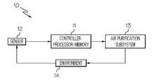 FIG. 1 is a block diagram of anECS10 according to an exemplary embodiment of the present invention. TheECS10 may include acontroller11, such as a computer having a processor and a memory, in continuous or intermittent communication with anair purification subsystem13 and one ormore sensors12. Thesensors12 may be positioned in various points throughout the ECS to sense contaminants in the outside air supplied through engine or APU bleeds, or other air sources including ground supplies and electric compressors, and/or recirculating air in the ECS and/or, in particular, anenvironment14, such an aircraft cabin. The contaminants in the ECS may include, for example, OVCs and/or SVOCs and/or ultrafine particles (UFPs).
