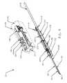 When theslide button168 is moved proximally into engagement with thegearbox input gear196, specifically the distalsmall gear198, also engages and turns a translationlarge input gear230 whoseshaft232 passes through anaft wall234 of theframe204. The proximallarge gear200 of thegearbox input gear196 engages and turns a rotationsmall input gear236 whoseshaft238 passes through theaft wall234. Theframe204 includes acarriage recess240, defined between apartition242 and theaft wall234, that contains longitudinally aligned left side lead (translation)screw244 and right-siderotation spur gear246 that are attached for rotation respectively with theshafts232,238. Thepartition242 is positioned aft of the left andright tabs222,224 of thecover20 and also defines in part the left andright spring cavities218,220. An unlockingcam247 projects proximally from and is longitudinally centered on theaft wall234 above the position of the lead (translation)screw244 androtation spur gear246.