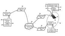 FIG. 1 is a simplified schematic illustrating an environment in which exemplary embodiments may be implemented. Anemergency server20 communicates with aclient device22 via acommunications network24. Theclient device22 is illustrated as an end user's mobilesmart phone26, but theclient device22 may be any computer, tablet, or any other processor-controlled device. Theemergency server20 provides one ormore emergency services28 to theclient device22. That is, should theclient device22 signal any emergency situation, theemergency server20 provides theemergency service28.
