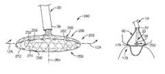 In the expanded position, thetreatment device250 may exhibit a basket-like configuration formed of a weavedstructure260 withmultiple strands262. Suchmultiple strands262 may include a super-elastic material, such as Nitinol wires, that may be insulated with a polymer formed thereon. Thetreatment device250 may define anaxis264 extending co-axially or parallel with thetreatment catheter20 such that thetreatment device250 may be configured to radially expand from and relative to theaxis264. Such weavedstructure260 may include various configurations to radially expand and conform to a valve annulus. For example, thetreatment device250 may include aproximal side266 and adistal side268, theproximal side266 radially extending with a generally convex periphery and the distal side including alip270 andpad portion272 extending along a lower or distal periphery of thetreatment device250. Thedistal side268 may also define aconcave portion274 extending along the periphery of thedistal side268. Further, thetreatment device250, in a fully expanded position, may include a substantially circular profile to exhibit an arcuate structure along the periphery (viewing the device from the proximal or distal sides). However, the weavedstructure260 of thetreatment device250 allows for the profile orlip270 of thetreatment device250 to conform to the size of the annulus of the valve. In this manner, the profile of thetreatment device250 may conform to an oval or kidney-bean shape, or any other valve shape. For example,FIG. 14 depicts a simplified view of thetreatment device250 in the expanded position positioned over amitral valve170, depicting a profile of thetreatment device250 conforming to a tissue shelf179 (see alsoFIG. 13) of theannulus177 of themitral valve170 with the one ormore electrodes256 in contact with the valve annulus.
