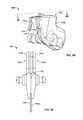 Theanchor device100 also includes a slopednose region130. The slopednose region130 can be a generally planar surface near the distal end of theretainer body110 that is oriented at a different angle than the generally planar surfaces of the first and second retainer body portions120a-b. The slopednose region130 can decline from the generally planar surfaces of the first and second retainer body portions120a-bsuch that thenose region130 slopes downward in a distal direction towards longitudinal shafts142a-bof the anchors140a-b(e.g., and thus downward to theskin penetration point32 when the anchor tines145a-bare deployed). As will be described further in reference toFIG. 6B, the slopednose region130 can facilitate an orientation of thedistal portion28 of themedical instrument20 that is directed toward theskin penetration point32. In this manner, the stresses that can potentially be exerted on theskin30 proximal to theskin penetration point32 by thedistal portion28 of themedical instrument20 can be reduced.