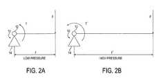 FIGS. 2A and 2B are schematic diagrams modified fromFIGS. 1A and 1B, which illustrate general pressure control of a constant force hydraulic motor winch. Such pressure control follows from the consequence of the winch forces depicted inFIGS. 1A and 1B. The hydraulic pressure is controlled so as to maintain a constant predetermined pulling force on the rope. As seen inFIG. 2A, when the distance “r” to the outside edge of the cable wound around the drum is relatively small due to the cable or rope being largely unwound, the load seen by the hydraulic motor is relatively small due to the decreased effective lever arm. To maintain the predetermined force on the rope, a relatively low pressure applicable to the hydraulic motor is required. As seen inFIG. 2B, as the cable or rope is wound around the drum, the distance “r” to the outside edge of the cable wound around the drum increases to “r′”, and the load seen by the hydraulic motor proportionally increases as well. If the hydraulic pressure were to be maintained as constant (as done in conventional winch devices), the pulling force on the rope would decrease proportionally. Accordingly, to avoid the decrease in pulling force and instead maintain the predetermined constant pulling force on the rope, the hydraulic pressure must be increased as seen inFIG. 2B. The result is that the hydraulic pressure applicable to the motor at r′ inFIG. 2B is a high pressure relative to the hydraulic pressure applicable to the motor at the shorter distance r inFIG. 2A.