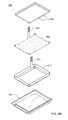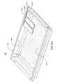 Hollow spacers213 may be placed belowdimples206 intop metal shell204, and rivets214 provided, extending through openings indimples206, throughhollow spacers213 and through openings in printedcircuit board210 tobase metal shell202 in order to fixedly secureelectronic assembly208 within the enclosure formed by base andtop metal shells202,204. A security mesh or tamper-respondent sensor216 is wrapped around the top, base, and four sides of the enclosure formed by base andtop metal shells202,204. As illustrated, in one or more embodiments,top metal shell204 may have an opening through which abus220 extends. One end ofbus220 may be connected to conductors (not shown) on printedcircuit board210, and the other end may be connected to conductors (not shown) on a printedcircuit board222. Asbus220 passes through the opening, the bus extends between aninner edge region223 of thesecurity mesh216 and an overlapping,outer edge region224 of thesecurity mesh216. A group ofwires226 connect, in one embodiment,security mesh216 to conductors on printedcircuit board210. Circuitry on printedcircuit board210 is responsive to a break or discontinuity insecurity sensor array216, in which case, an alarm signal may be emitted onbus220, and also encryption/decryption keys stored withinelectronic assembly208 may be erased.