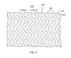 Note also that a variety of materials may advantageously be employed to form the circuit lines. For instance, the circuit lines may be formed of a conductive ink (such as a carbon-loaded conductive ink) printed onto one or both opposite sides of one or more of theflexible layers302 in a stack of such layers. Alternatively, a metal or metal alloy could be used to form the circuit lines, such as copper, silver, intrinsically conductive polymers, carbon ink, or nickel-phosphorus (NiP), or Omega-Ply®, offered by Omega Technologies, Inc. of Culver City, Calif. (USA), or Ticer™ offered by Ticer Technologies, Chandler, Ariz. (USA). Note that the process employed to form the fine circuit lines or traces on the order described herein is dependent, in part, on the choice of material used for the circuit lines. For instance, if copper circuit lines are being fabricated, then additive processing, such as plating up copper traces, or subtractive processing, such as etching away unwanted copper between trace lines, may be employed. By way of further example, if conductive ink is employed as the circuit line material, fine circuit lines on the order disclosed herein can be achieved by focusing on the rheological properties of the conductive ink formulation. Further, rather than simple pneumatics of pushing conductive ink through an aperture in a stencil with a squeegee, the screen emulsion may be characterized as very thin (for instance, 150 to 200 μm), and a squeegee angle may be used such that the ink is sheared to achieve conductive ink breakaway rather than pumping the conductive ink through the screen apertures. Note that the screen for fine line width printing such as described herein may have the following characteristics in one specific embodiment: a fine polyester thread for both warp and weave on the order of 75 micrometers; a thread count between 250-320 threads per inch; a mesh thickness of, for instance, 150 micrometers; an open area between threads that is at least 1.5× to 2.0× the conductive ink particle size; and to maintain dimensional stability of the print, the screen snap-off is kept to a minimum due the screen strain during squeegee passage.