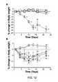 FIG. 12B is a graph of the percent change in body weight relative to the initial weight (g) over the treatment duration for transdermal (placebo patch—▪, one patch—▴ or two patches—▾) administration relative to untreated animals—●) for the administration period. Values represent the mean and SEM of 10 animals with the exception of the cisplatin group (n=3-10, due to mortality). Statistical significance indicated by (*) and represents p<0.05.