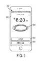 With regard toacts519 and523, the snooze and off buttons may be situated on the secondary device and/or primary device as described. For example, with regard to the primary device that is in communication with the secondary device when an alarm event occurs, the process may generate a GUI to indicate to a user a current status of the alarm event and on/off/snooze keys (e.g., user interface objects such as a display of selectable buttons provided on the UI) for a user to select. For example,FIG. 8 shows a screen shot800 of a portion of an alarm configuration GUI801 generated for example on a primary device in accordance with embodiments of the present system. Agraphical representation804 may illustrate a current status of the secondary device (e.g., vibrating). One or more menu items such as Stop and Snooze menu items,806 and808, respectively, may include menu-items generated in accordance with embodiments of the present system. Thegraphical representation804 may be based upon the alarm information.