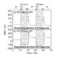 FIG. 5A shows responses of a CO sensor having a Pt(15Bi2O3) sensing electrode and a Pt reference electrode and a CO sensor having a Pt(15CeO2) sensing electrode and a Pt reference electrode to 300 ppm CO. The responses, ΔEMFs, of the Pt(15Bi2O3) electrode and the Pt(15CeO2) electrode to CO have opposite signs. A CO sensor of an embodiment having a Pt(15Bi2O3) sensing electrode and a Pt(15CeO2) reference electrode had a significant response corresponding to the sum of two changes in electromotive force (FIG. 6).